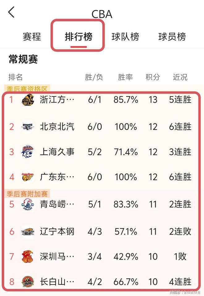 截止目前,北京首钢和广东男篮,同为6胜0负成绩,由于广厦和上海多赛一轮,故广厦男篮以6胜1负,排积分榜第一位;北京首钢以6胜0负,排积分榜第二位;上海队以5胜2负,排积分榜第三位;广东队以6胜0负,排积分榜第四位;青岛队以5胜1负,排积分榜第五位;辽宁队以4胜3负,排积分榜第六位;深圳队以3胜4负,排积分榜第七位;吉林队以4胜2负,排积分榜第八位。